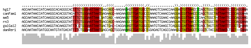 ########################### RNAz 0.1.1 ############################# Sequences: 6 Slice: 1 to 120 Columns: 120 Strand: + Mean pairwise identity: 75.75 Mean single sequence MFE: -34.30 Consensus MFE: -24.58 Energy contribution: -24.72 Covariance contribution: 0.14 Mean z-score: -2.49 Structure conservation index: 0.72 SVM decision value: 2.17 SVM RNA-class probability: 0.989492 Prediction: RNA ###################################################################### >hg17.chrX/45492242-45492123 AGCAAUAACCAUCAAGGCACAGGGCACUUUCUGGGAAUUAAUGAGCAGCAAGAAGAGUUGAUGGCCUAAAGUCGAACCAAGGACUGUUAACCCCAGCUGGCUAUUAAUUCCCCAGGAAA .((.....((.....))......))..((((((((((((((((..((((.....(.(((((((((((............))).)))))))))...))))..)))))))).)))))))). ( -32.80) >canFam1.chrX/39473557-39473438 AGCAAUAACCAUCAAGGCACACGGUACAUUCUGGGAAUUAAUGAGAAGCAAGAAGGGUUGAUGGCCCAAAGUCAAACCAAGGACCGUUAACCCCAGCUGGCUAUUAAUUCCCCAGGAAA .......(((............)))...((((((((((((((....(((.((..((((((((((.((.............)).))))))))))...)).)))))))))).))))))).. ( -36.22) >mm5.chrX/17597895-17597777 AGCAAUAACCAUCAAGGCACAGGACAUUUUCUGGGAAUUAACGAUCAGCAAGAAGGUUUGAUGGUCUAAAGUGGAACAAGGACCGUUAACCCCAACUGGCUAUUAAUUCCCCAGGAAG ........((.....))..........((((((((((((((.(..(((......((.((((((((((............)))))))))).))...)))..).)))))).)))))))). ( -30.20) >rn3.chrX/145954045-145954164 AGCAAUAACCAUCAAGGCACAGGGUAUUUUCUGGGAAUUAAUGAGCAGCAAGAAGGCUUGAUGGUCUAAAGUUGAACGAAGGACUGUUAACCUCAGCUGGCUAUUAAUUCCCCAGGAAA .......(((............))).(((((((((((((((((..((((....(((.((((((((((...(.....)...)))))))))))))..))))..)))))))).))))))))) ( -35.60) >galGal2.chr1/83958280-83958399 AGCAAUAACAAUCAAGGUACAAGGUAUUUCCUGGGAAUUAAUGACUGACCAGGAGAGUUGAUGGGCCAAUGUGAAGCUCAGGGCCAUUAACUUCAGCUAGUCAUUAAUUUCCCUGAAAA ...........(((.......(((.....)))(((((((((((((((.(...((.(((((((((.((...(.....)...)).))))))))))).).))))))))))))))).)))... ( -37.10) >danRer1.chrNA/107870518-107870636 AACAAUAAUGAUGGCAAUGUAUGACAUUUUCUGGGAAUUAAUGAGCAGCUGGGAAAAGCUGAUGGCUGGAGAGUCAGCCAAAGGCUAUUAGCUUCGGUCUACCAUUAAUCUCCUGAAA .........((((.((.....)).))))(((.((..(((((((..(((((......)))))..((((((((....((((...)))).....))))))))...)))))))..)).))). ( -33.90) >consensus AGCAAUAACCAUCAAGGCACAGGGCAUUUUCUGGGAAUUAAUGAGCAGC_AAGAAGAGUUGAUGGCCUAAAGUCGAACCAAGGACCGUUAACCCCAGCUGGCUAUUAAUUCCCCAGGAAA ...........................((((((((((((((((..((((......((((((((((.((.............)).))))))))))..))))..)))))))).)))))))). (-24.58 = -24.72 + 0.14)